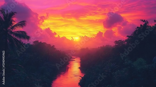 Vibrant sunset over tropical river valley; scenic nature background; possible use in travel brochure or nature calendar