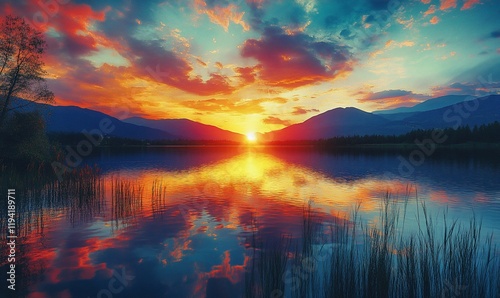 Vibrant sunset reflecting on calm lake water, surrounded by mountains.