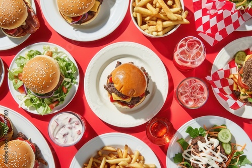 Vibrant table setup with classic burgers and sides in a nostalgic diner environment..