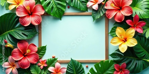 Vibrant Tropical Floral Frame with Lush Green Foliage and Brightly Colored Hibiscus and Plumeria Blossoms, Ideal for Summer Designs or Vacation Themed Projects