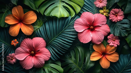flower, tropical, leaf, hibiscus, plumeria, foliage, flora, bloom, blossom, botanical, exotic, lush, green, pink, orange, red, vibrant, colourful, nature, plant, garden, paradise, summer, beauty, floral, design, pattern, texture, artistic, photo, closeup, macro, still life, arrangement, composition, background, wallpaper, decor, image, visual