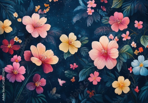Vibrant Tropical Floral Pattern on Dark Background Featuring Various Colorful Flowers and Lush Green Leaves in Artistic Style