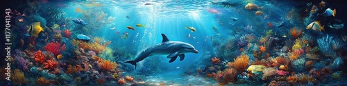 Vibrant Underwater Panorama Showcasing Dolphins in Their Natural Ocean Habitat