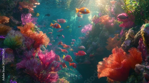 Vibrant underwater scene of fish swimming through a colorful coral reef.