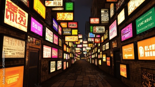 Vibrant Urban Alleyway Illuminated by Colorful Neon Signs at Night