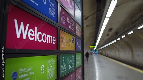 vibrant "Welcome" sign in multiple languages, showcasing the international nature of air travel. Airport signs, traffic signs, airport symbols