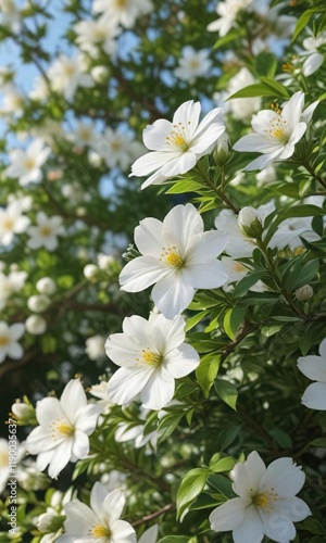 Vibrant white flowers on bush with sweet nectar, buds, leaves