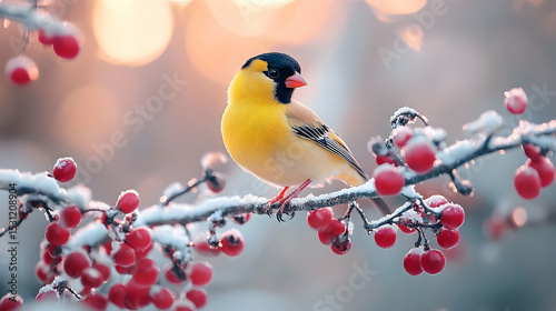 Vibrant yellow bird perched on a winter branch laden with berries.