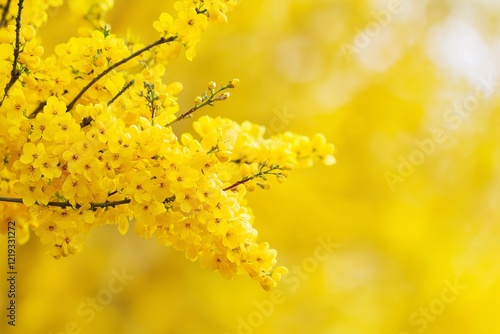 Vibrant yellow blossoms beautifully decorating a branch in soft focus.