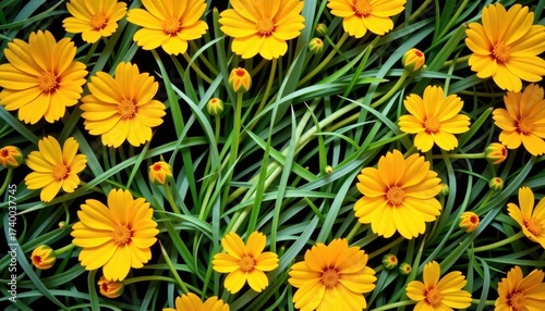 Vibrant yellow cosmos flowers arranged with green grass in a flat lay composition. Perfect for summer or autumn themes, grass, composition