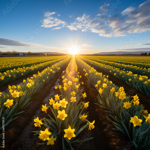 Vibrant Yellow Daffodils Blooming in Rows Under a Clear Blue Sky, Bathed in Setting Sunlight