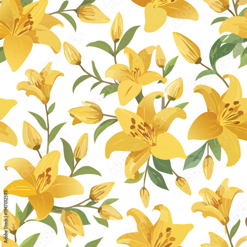 Vibrant yellow lily floral pattern seamlessly repeating on white background