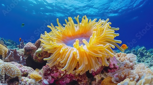 Vibrant Yellow Sea Anemone Among Coral Reefs in Clear Ocean Water