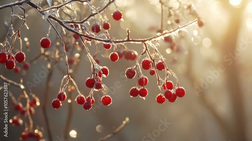 Viburnum branches adorned with vibrant red berries encased in ice set against a sunny forest backdrop during a cold winter rain Capturing the essence of winter and the changing seasons
