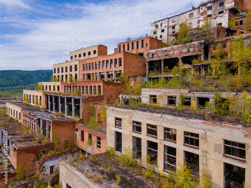 View from above. Ruined and abandoned buildings of a tin mining factory in the village of Kavalerovo. Khrustalnensky ore mining and processing plant