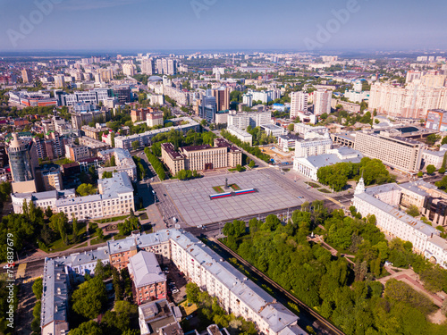 View from drone of center of Voronezh with Lenin Square and panel buildings, Russia