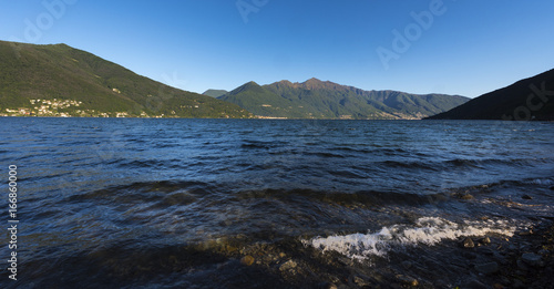 View from Maccagno to the other lake side to Cannobio In the background the Swiss Alps - Maccagno, Lake Maggiore, Varese, Lombardy, Italy