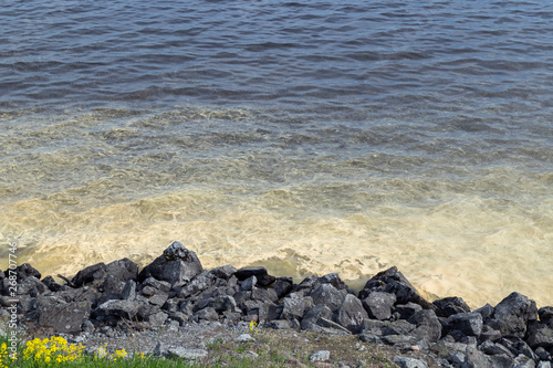 View of a lake with surface of the the water near the shoreline covered with pollen in Finland in the spring.