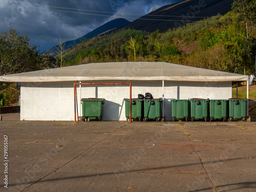 View of a line of green waste containers against a white building at the marketplace of the colonial town of Villa de Leyva, in the Andean mountains of central Colombia.