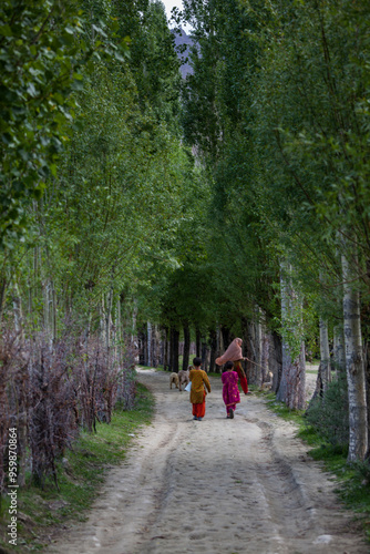 View of a serene pathway through lush trees with people walking, Phander, Gilgit-Baltistan, Pakistan.