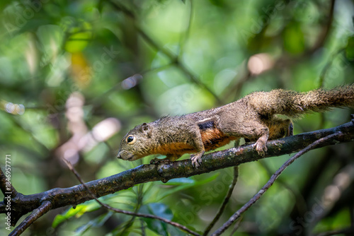 View of a squirrel with brown fur perched carefully on a branch amidst a lush green forest, its eyes alert, in Sungei Buloh Wetland Reserve, Neo Tiew Crescent, Singapore.