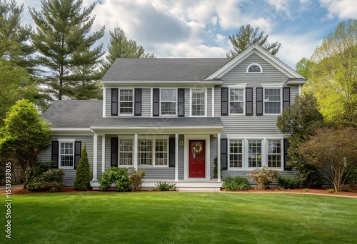 house, lawn, tree, sky, cloud, exterior, architecture, building, home, window, shutter, door, residential, property, facades, design, estate, suburban, countryside, roof, siding, landscaping, daytime, yard, red door, two-story, front yard, greengrass, sunny day, real estate, cloudy sky, tree, grass, house-building