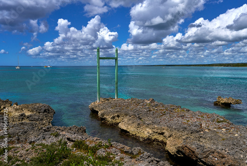 View of Bayahibe Bay with boats and wooden arch by the sea on coastal rocks