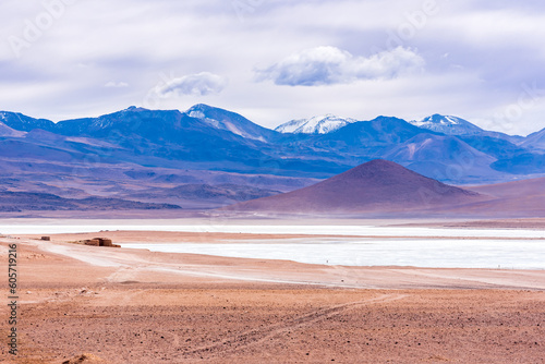 View of frozen lagoon and Andes mountain range in the bolivian plateau