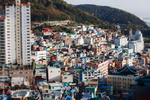 View of Gamcheon Culture village, Busan city, South Korea, Gamcheon-dong, Saha District, beautiful view of streets and multicoloured houses in a summer sunny day, Republic of Korea travel