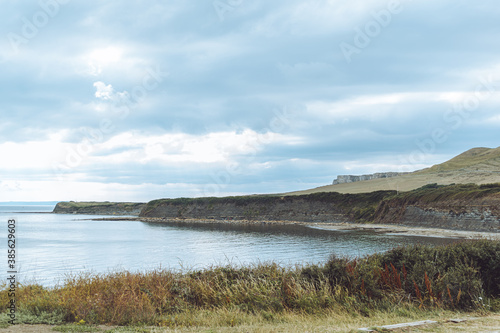 View of Kimmeridge Bay, Dorset UK, landscape vista shot of calm ocean water, dramatic overcasted sky