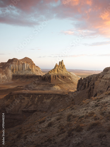 View of majestic rock formations and cliffs bathed in the warm glow of the setting sun, creating a stunning desert landscape, Shetpe, Mangystau Region, Kazakhstan.