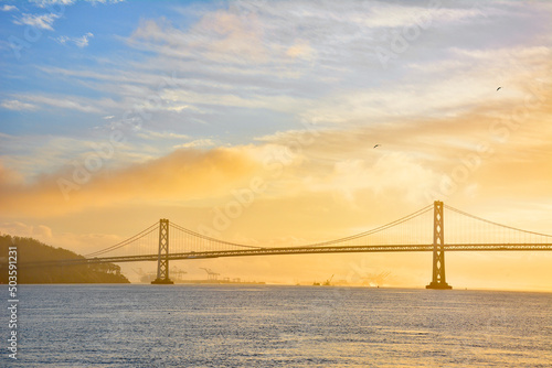View of Oakland Bay Bridge with sunrise colors in San Francisco, California