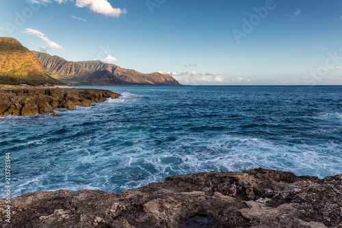 View of rocky coastline in warm evening sunlight, Oahu island, Hawaii