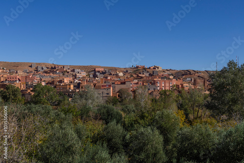 View of scenic Rose Valley with traditional architecture and hills, Draa-Tafilalet, Morocco.
