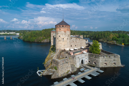 View of the ancient fortress of Olavinlinna on a sunny July day (shooting from a quadrocopter). Savonlinna, Finland