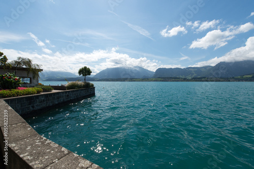 View of the lake Thun, Switzerland seen from the walking path between the village of Oberhofen and the city of Thun.
