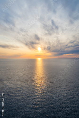 View of the majestic sunset over the Barents Sea with the midnight sun, Honningsvag, Norway.