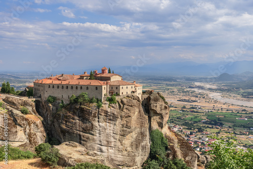 View of Thessaly valley with Kalabaka townr and historic Eastern Orthodox St. Stephen Holy Monastery nestled on a rocky plateau, Meteora, Greece.