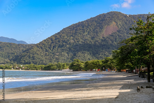 View of wonderful Praia do Lazaro (Lazaro Beach)on a sunny day with rainforest mountains, Ubatuba, Brazil