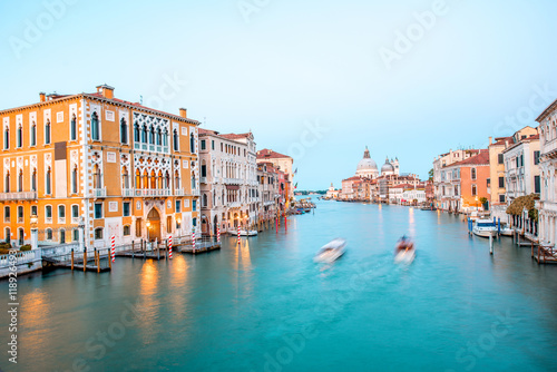 View on illuminated Grand canal with Santa Maria basilica from Accademic bridge at the dusk in Venice. Long exposure image technic