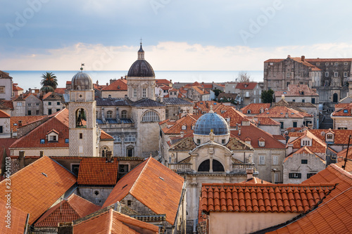 View over the orange roofs of old town Dubrovnik with church towers and ocean in winter, Croatia