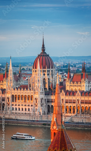 View to Hungarian Parliament on the Danube river at sunset from Fisherman Bastion