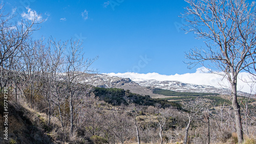 View to rocky mountains partly covered by snow with clear blue sky and clouds in background and trees without leaves in the foreground
