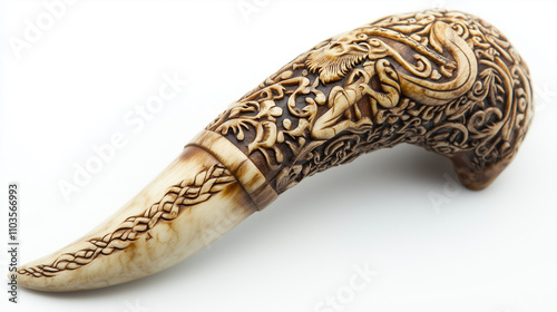 Viking war horn with intricate carvings of mythical creatures
