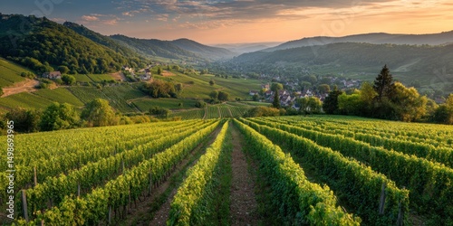 vinery, sunrise, vale, hill, grape, wine, landscape, nature, scenic, travel, farm, agriculture, green, plant, mountain, idylli, beautiful, tour tourism, countryside, european, charming, village, tranquil, peaceful, view, sunset, gold, light, vibrant, colours, summer, amazing, photo, picture