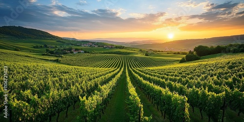 Vineyard Landscape at Sunset with Rolling Hills and Village in Distance
