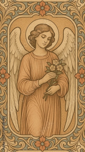 illustration, decorative, celestial, wallpaper, artistic, peaceful, classic, elegant, flower, pattern, vintage, border, design, figure, floral, mobile, ornate, serene, angel, beige, brown, frame, retro, wing, halo, art, angelic