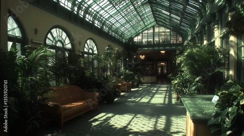 Vintage atrium filled with lush green plants and abundant sunlight indoor