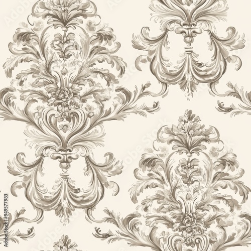 Vintage Baroque cartouche motif pattern on vintage beige fabric background, seamless repeating pattern, textile print style, minimal, Baroque design, seamless cartouche motif pattern