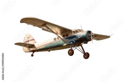 Vintage biplane aircraft flying with landing gear down against clear sky, cut out